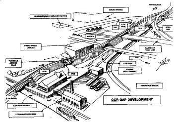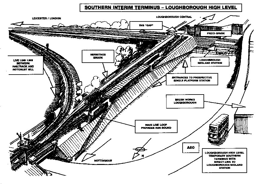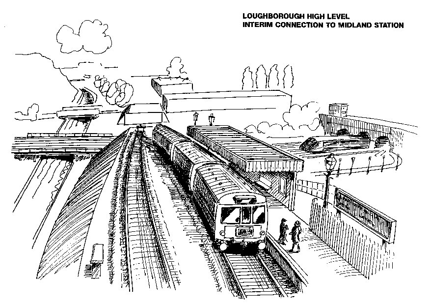 Initially, once the track from Rushcliffe Halt to Loughborough has been purchased, a temporary station will be constructed on the north embankment and served by GC(N) trains. A footpath connection will be made with Loughborough Midland.